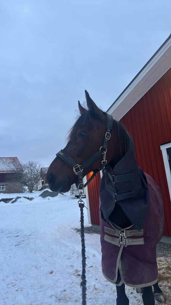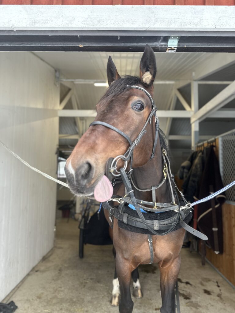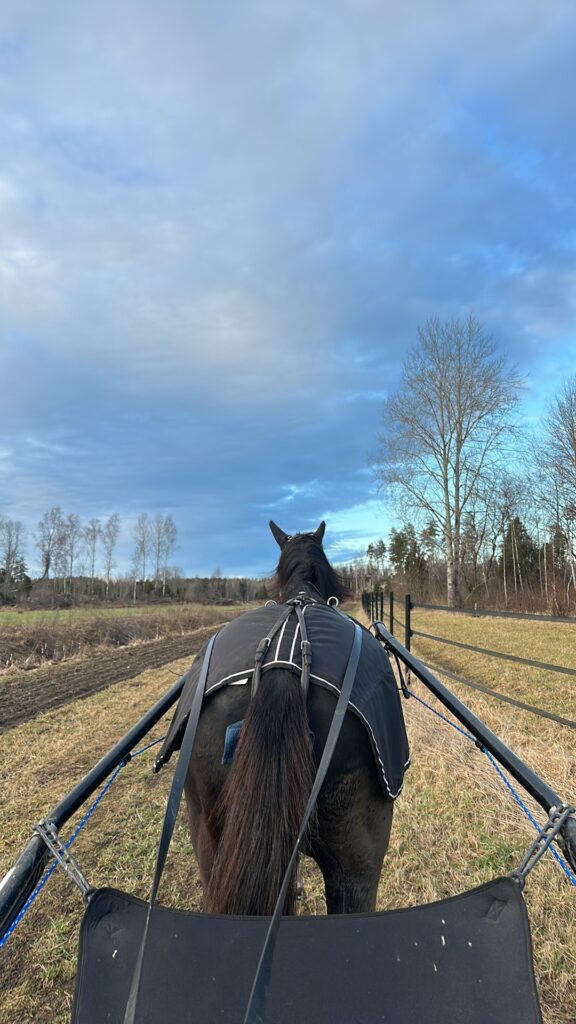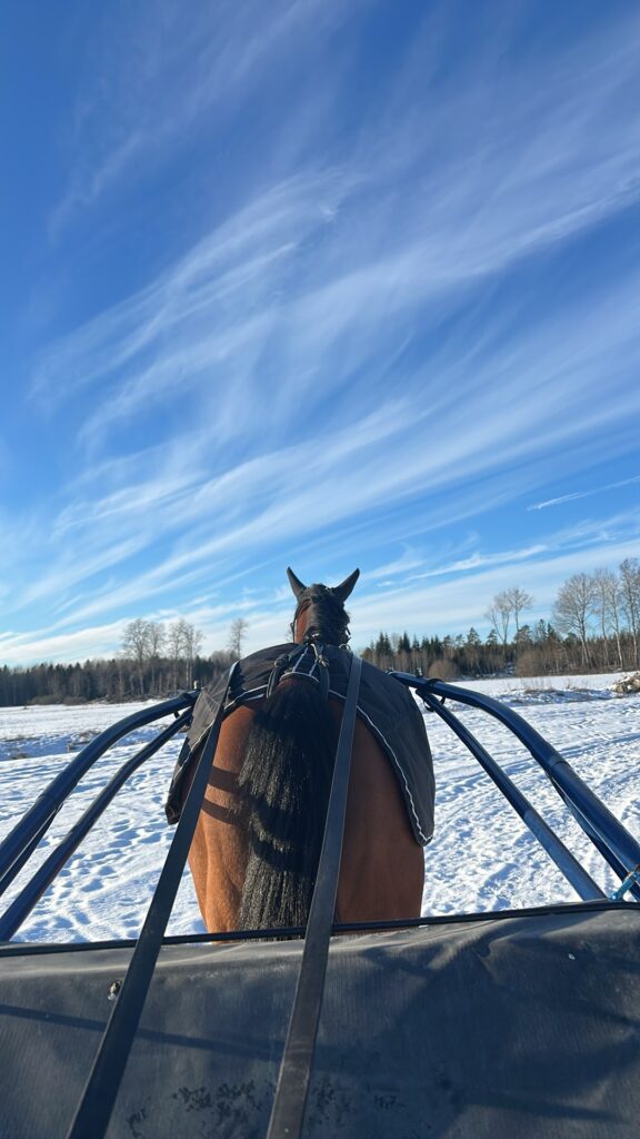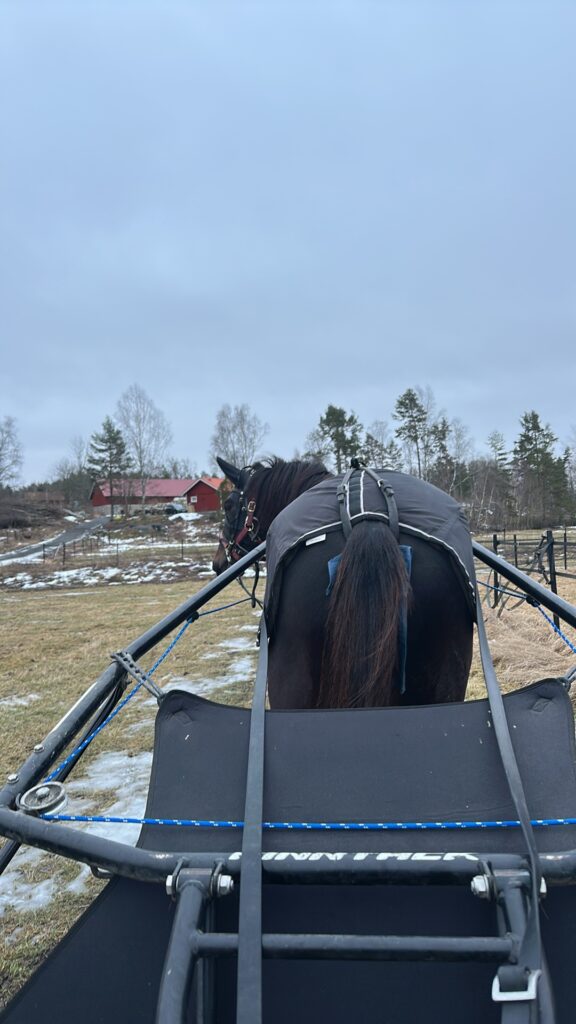 Då all snö smält och tjälen börjar gå ur har hästarna bara fått skritta med tryckvagn hemma. Vi tänkte fortsätta så ett tag till innan vi ska träna mer och sikta mot start!